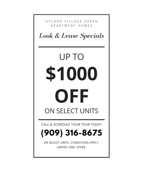 Welcome home to Upland Village Green, the finest apartment home living in Upland, California. Nestled in the foothills of the San Gabriel mountains, Mount Baldy creates a spectacular backdrop in the California sky. Unique shopping and dining offerings are available at the Colonies. Relax while you tour the Ontario Museum of Art or spend a weekend in the mountains hiking and fishing. Our advantageous location allows for a variety of adventures to please anyone.